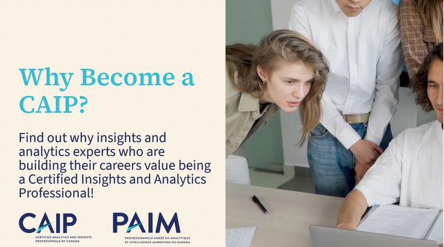 The Certified Analytics and Insights Professionals of Canada (CAIP Canada) is the professional body for Canada’s Certified Analytics and Insights Professionals (CAIPs). Its mission is to power the success of businesses and organizations by ensuring that CAIPs have the competencies needed to unlock the power of data while maintaining the highest ethical standards that protect the public trust.